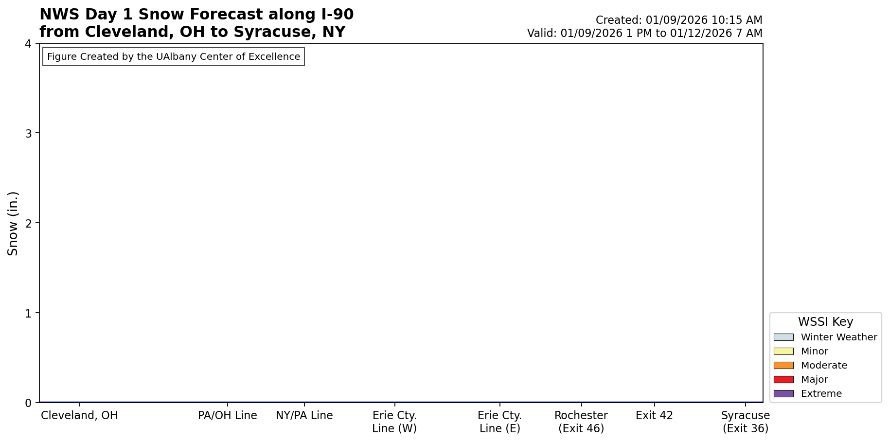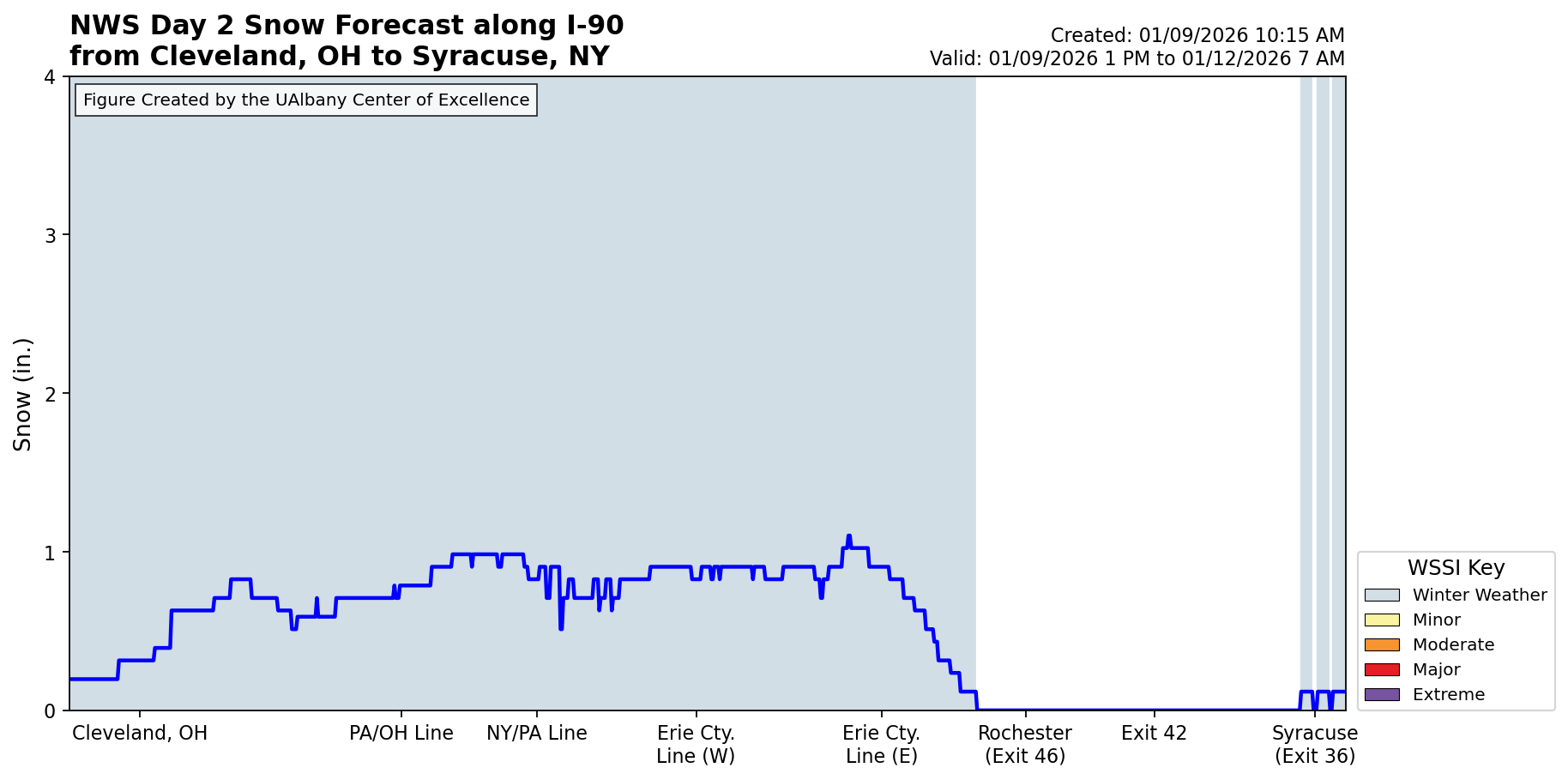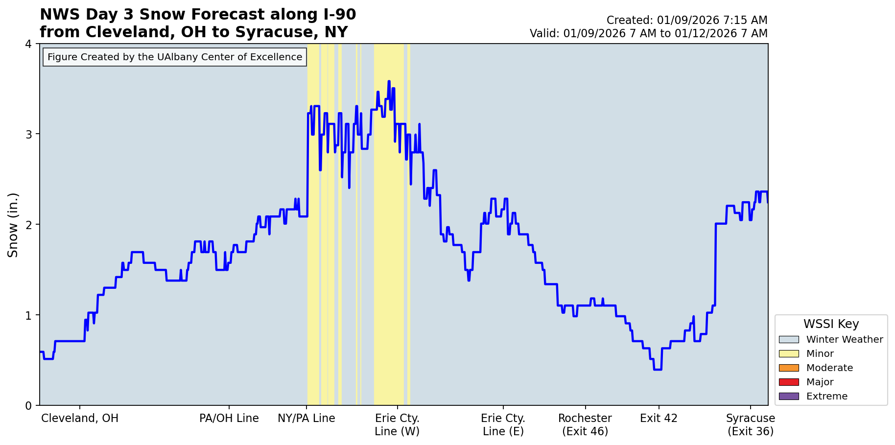 Latest Days 1 - 3 Snow Forecast and WSSI Along I-90 from Cleveland to Syracuse (click to enlarge):