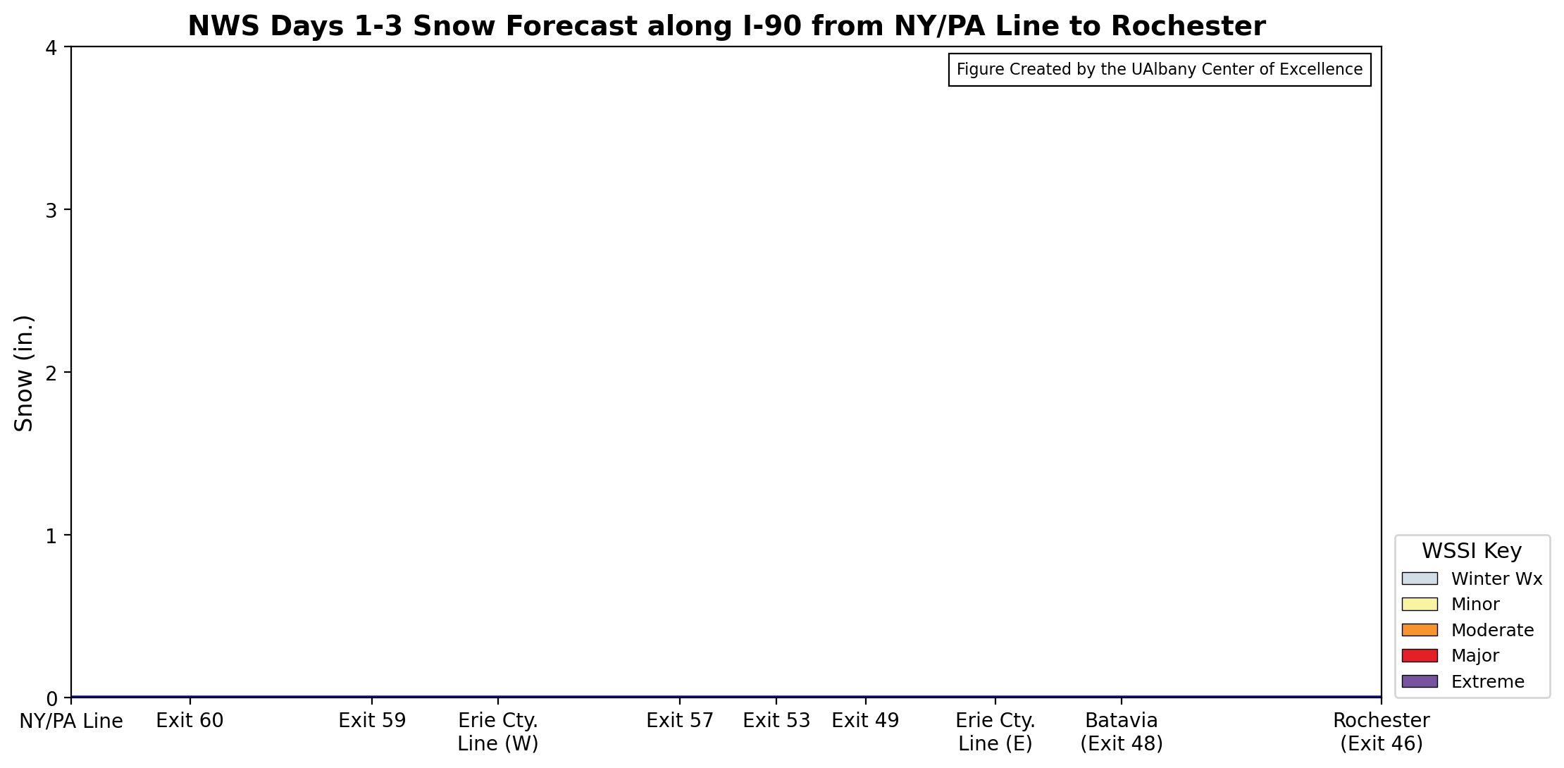 Latest Days 1 - 3 Snow Forecast and WSSI Along the NYS Thruway from the NY-PA Border to Rochester (click to enlarge):